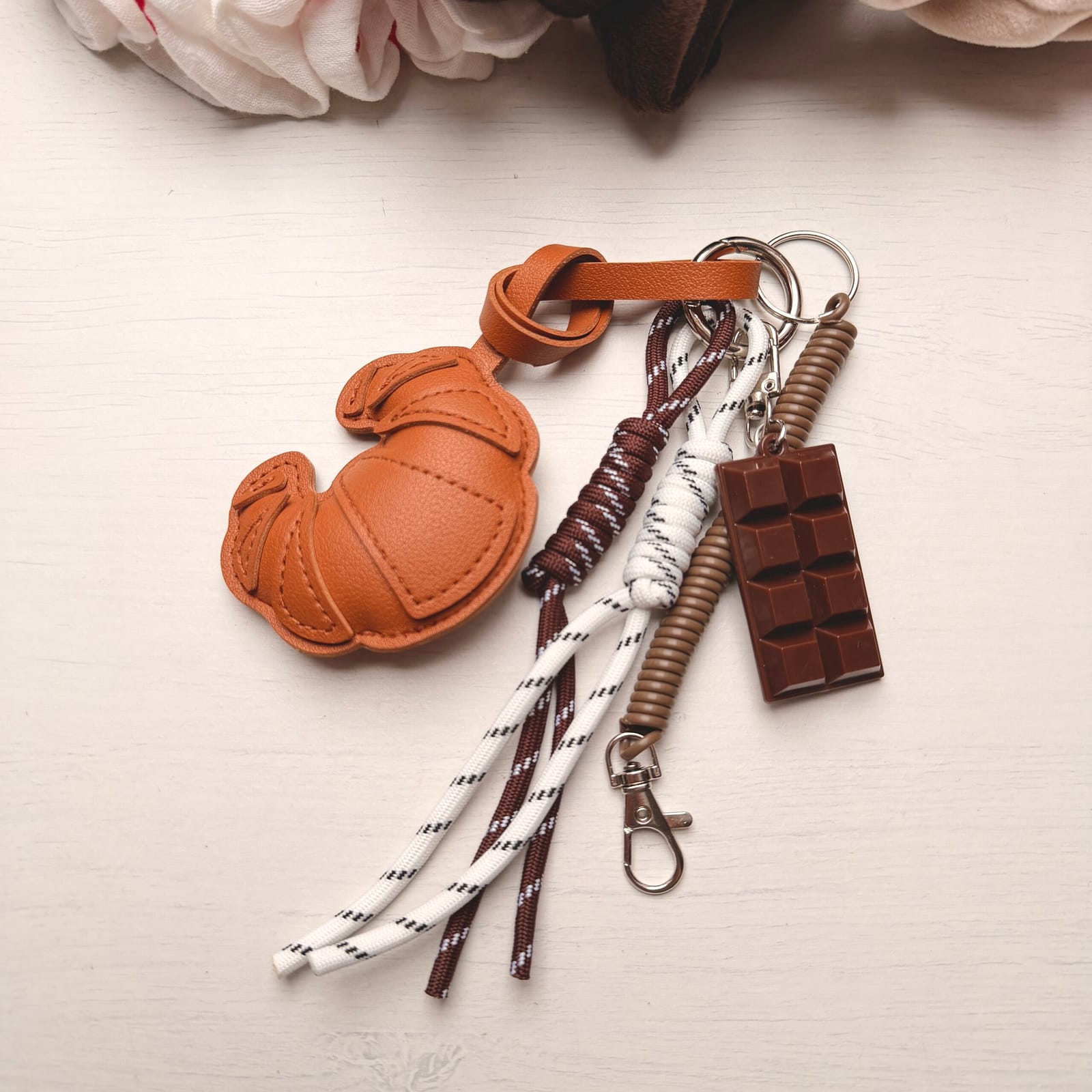 Brelok do kluczy Brelok Croissant & Chocolate z zawieszką w kształcie croissanta, tabliczką czekolady i ozdobnymi sznurkami w kolorach brązu i bieli na jasnym tle. Idealny dodatek dla osób, które lubią drobne detale w stylu coffee aesthetic i eleganckie akcesoria na co dzień.