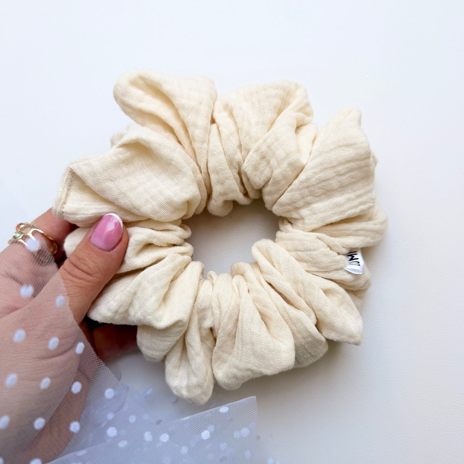 Została wykonana z delikatnego muślinu 100% bawełny, który jest niezwykle miękki, oddychający i przyjemny w dotyku. Materiał łagodnie otula włosy, dzięki czemu gumka utrzymuje fryzurę stabilnie, ale bez ciągnięcia i bez nieprzyjemnego napięcia. To szczególnie ważne przy codziennym noszeniu – zarówno w luźnym kucyku, jak i w kokach czy półupięciach.
