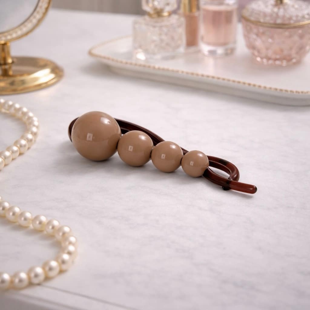 Minimalistyczna spinka do włosów ozdobiona gładkimi kulkami w neutralnym, ciepłym odcieniu. Łączy funkcję biżuterii do włosów z realnym trzymaniem fryzury.